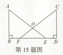 15. 如图,点$E$,$F$在$BD$上,$AB = CD$,$BF = DE$,$\angle B = \angle D = 90^{\circ}$,$AE$与$CF$交于点$O$,$OF = 6cm$,求$OE$的长。