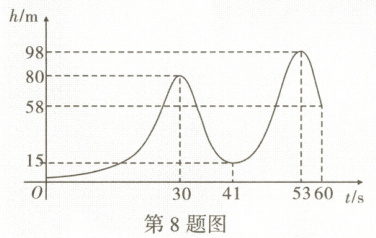 8. 小明在游乐场坐过山车,在某一段$ 60\ s $内过山车的高度$ h $(单位:$ m $)与时间$ t $(单位:$ s $)之间的函数关系图象如图所示,下列结论错误的是 (