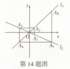 14. 如图,在平面直角坐标系中,已知直线$ l_{1}:y_{1} = x $和$ l_{2}:y_{2} = -\dfrac{1}{2}x $的图象,已知点$ A_{1}(1,m) $是直线$ l_{2} $上一点,过点$ A_{1} $作$ x $轴的垂线交$ l_{1} $于点$ A_{2} $.