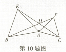 10. 核心素养·推理能力 如图,$ \triangle ABE $和$ \triangle AFC $是等边三角形,$ AE \perp AF $,连接$ BF $,$ CE $,交于点$ D $.有以下结论:①$ \angle BAC = 150^{\circ} $;②连接$ BC $,$ BC = BF $;③连接$ EF $,$ EF = 2AF $;④连接$ AD $,$ AD $平分$ \angle BDC $;⑤连接$ AD $,$ BD = AD + ED $.其中正确的结论有 (