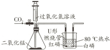 (1)关闭弹簧夹,在U形燃烧管中加入等量的白磷和红磷,浸入80℃的热水中,观察到白磷燃烧,红磷不燃烧。白磷燃烧的化学方程式为