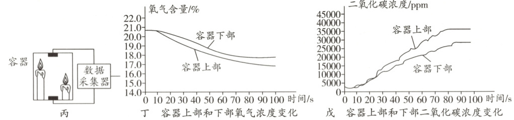 (6)点燃蜡烛,盖上容器(如图丙),利用数字化仪器测量燃烧过程不同位置的氧气、二氧化碳浓度,绘制曲线见图丁和图戊。