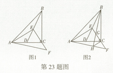 23. 如图 1,在△ABC 中,∠ACB = 90°,AC = BC,点 E 为△ABC 的中线 BD 上的一点,将线段 AE 以点 E 为旋转中心逆时针旋转 90°得到线段 EF,EF 恰好经过点 C.