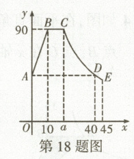 18. 【核心素养·抽象能力】通过实验研究发现,初中生在课堂中的专注度随着上课时间的变化而变化,刚上课时,学生兴趣激增,10 min 后保持平稳一段时间,20 min 后注意力开始分散.若学生的专注度 $ y $ 随时间 $ x $(单位:min)变化的函数图象如图所示,当 $ 0 \leq x < 10 $ 和 $ 10 \leq x < a $ 时,图象是线段;当 $ a \leq x \leq 45 $ 时,图象是双曲线的一部分.根据函数图象回答下列问题.