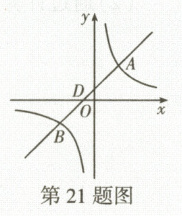 21. 如图, 在平面直角坐标系中, 一次函数 $ y = x + 1 $ 与反比例函数 $ y = \frac{a}{x}(a \neq 0) $ 的图象交于点 $ A(2, m) $ 和点 $ B $, 与 $ x $ 轴交于点 $ D $.
