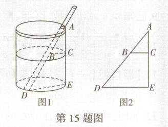 15. 如图,装有某种液体的工业用桶中放置有一根搅拌棍.工人师傅为了解桶内所装液体的体积,先在搅拌棍所处桶孔位置做好标记点$A$,并取出;然后测得搅拌棍接触到液体部分$BD$为$1m$,搅拌棍$A$到底端$D$处的长度为$1.5m$,最后测量出桶的高$AE$为$1.2m$,圆桶内壁的底面直径为$1m$.已知桶内的液面与桶底面平行,其平面示意图如图2所示.请你根据以上数据,帮工人师傅计算出桶内所装液体的体积(结果保留$\pi$).