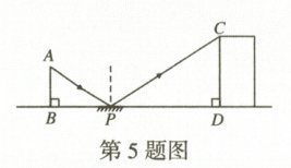 5. 【核心素养·模型观念】某数学兴趣小组来到时代广场,设计用手电来测量广场附近某大厦 $CD$ 的高度.如图,点 $P$ 处放一水平的平面镜,光线从点 $A$ 出发经平面镜反射后刚好射到大厦 $CD$ 的顶端 $C$ 处.已知 $AB\perp BD$,$CD\perp BD$,测得 $AB = 1.5$ m,$BP = 2$ m,$PD = 52$ m,则该大厦的高度约为 (