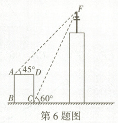 6. 【新情境】如图,某高楼顶部有一信号发射塔,在矩形建筑物 $ ABCD $ 的 $ A $, $ C $ 两点测得该塔顶端 $ F $ 的仰角分别为 $ 45° $ 和 $ 60° $,矩形建筑物的宽度 $ AD = 20 m $,高度 $ DC = 30 m $,则信号发射塔顶端 $ F $ 到地面的距离是 (