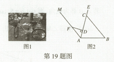 19. 【核心素养·模型观念】如图1是共享单车的实物图,图2是共享单车的车架示意图,点$A$,$D$,$C$,$E$在同一条直线上,$CD = 35$cm,$DF = 24$cm,$AF = 30$cm,$FD \perp AE$于点$D$,座杆$CE = 15$cm,且$\angle EAB = 75^{\circ}$.