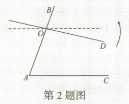 2. 如图,$\angle A = 70^{\circ}$,点O是AB上一点,直线OD与AB所夹的$\angle BOD = 82^{\circ}$.要使$OD // AC$,直线OD绕点O按逆时针方向至少旋转(