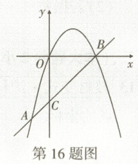 16. 如图,直线 $ y = x + b $ 与坐标轴分别交于 $ B, C $ 两点,其中点 $ C $ 的坐标为 $ (0, -2) $,抛物线 $ y = -x^2 + mx $ 与直线 $ y = x + b $ 交于 $ A, B $ 两点.