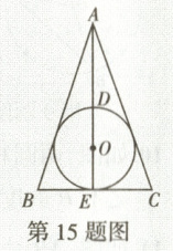 15. 如图,在△ABC 中,AB = AC,⊙O 是△ABC 的内切圆,连接 AO 交⊙O 于点 D,延长 AO 交 BC 于点 E,则 E 为 BC 与⊙O 的切点.