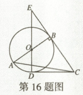 16. 如图,在 Rt△ABC 中,∠ABC = 90°,以 AB 为直径作⊙O,点 D 为⊙O 上一点,且 CD = CB,连接 DO 并延长交 CB 的延长线于点 E.