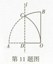 11. 如图,将扇形 $ AOB $ 翻折,使点 $ A $ 与圆心 $ O $ 重合,展开后折痕所在直线 $ l $ 与 $ \overset{\frown}{AB} $ 交于点 $ C $.若 $ OA = 2 $, 则 $ \overset{\frown}{OC} $ 的长为
