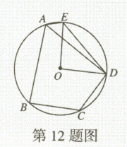 12. 如图,在 $ \odot O $ 的内接四边形 $ ABCD $ 中, $ AB = AD $, $ \angle C = 120^{\circ} $,点 $ E $ 在 $ \overset{\frown}{AD} $ 上,连接 $ OD $, $ OE $, $ AE $, $ DE $. (1) $ \angle AED $ 的度数是