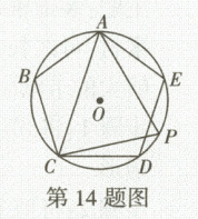 14. 如图,正五边形 $ ABCDE $ 的外接圆为 $ \odot O $,点 $ P $ 是劣弧 $ DE $ 上一点,连接 $ AC $, $ AP $, $ CP $,求 $ \angle ACP + \angle CAP $ 的度数.