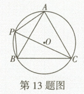 13.证明:在$\odot O$中,$\because \angle BAC$与$\angle CPB$是$\overset{\frown}{BC}$所对的圆周角,$\angle ABC$与$\angle APC$是$\overset{\frown}{AC}$所对的圆周角,
