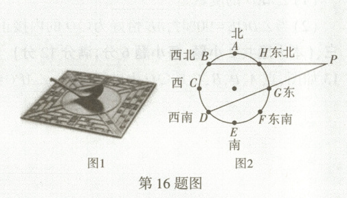 16. 【新情境】司南是我国古代辨别方向用的一种仪器,早在战国时期就已被发明,是现在所用指南 针的始祖(如图 1).司南中心为一圆形,圆心为点 $ O $,直径为 $ 20 \, cm $,根据八个方位将圆形八等分 (图 2 中的点 $ A \sim H $),连接 $ DG $, $ BH $ 并延长交于点 $ P $. (1)点 $ P $ 位于点 $ D $ 的北偏东