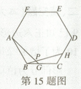 15. 如图,点 $ G $, $ H $ 分别是正六边形 $ ABCDEF $ 的边 $ BC $, $ CD $ 上的点,且 $ BG = CH $, $ AG $ 与 $ BH $ 交于点 $ P $. (1)求证: $ \triangle ABG \cong \triangle BCH $. (2)求 $ \angle APH $ 的度数.