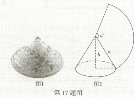素材:母线长为 $ 25 \, cm $、高为 $ 20 \, cm $ 的锥形草帽(如图 1)和五张颜色不同(红、橙、黄、蓝、紫)、足 够大的卡纸.