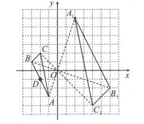 (1)在所给的网格图中描出边$ AB $的中点$ D $,并写出点$ D $的坐标.