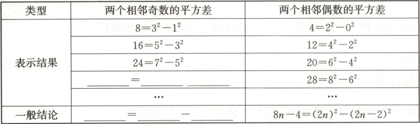 18. 新方向·项目式学习 数学兴趣小组开展了一项探究活动,主题是“两个相邻奇数/偶数的平方差”.相关内容如下表所示: