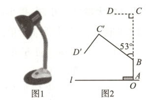 19. 如图1所示,在水平桌面上放置着一盏台灯.如图2,水平桌面记为$l$,台灯的底座OA高度为2 cm,支撑架AB长度为10 cm,连接杆BC长度为32 cm,且点A,B,C在一条直线上,灯盘CD与连接杆BC垂直,其长度为15 cm.如图2,当连接杆BC绕点B逆时针旋转$53^{\circ}$后得到$BC'$,且灯盘$C'D'$始终与连接杆$BC'$垂直,求此时点$D'$离桌面$l$的高度.(结果保留整数.参考数据:$\sin 53^{\circ}\approx \dfrac{4}{5}$,$\cos 53^{\circ}\approx \dfrac{3}{5}$,$\tan 53^{\circ}\approx \dfrac{4}{3}$)