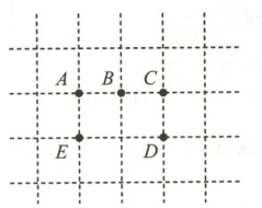 13. 如图,在一个正方形的网格上有$A,B,C,D,E$五个点,任意连接其中3个点,在构成的三角形中,是直角三角形的概率为