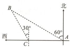 19. 如图,一船以 20 海里/时的速度向西航行,在$A$处测得灯塔$B$在北偏西$60^{\circ}$的方向上,继续航行 1 小时到达$C$处,再测得灯塔$B$在北偏西$30^{\circ}$的方向上. 已知灯塔$B$四周 15 海里内有暗礁,问该船继续向西航行是否安全?