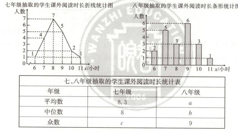七年级阅读时长中,8小时人数最多,$\therefore c = 8$,