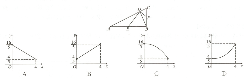 10. 如图,在$Rt\triangle ABC$中,$\angle ABC=90^{\circ}$,$AB=4$,$BC=2$,$BD$是边$AC$上的高.点$E$,$F$分别在边$AB$, $BC$上(不与端点重合),且$DE\perp DF$.设$AE=x$,四边形$DEBF$的面积为$y$,则$y$关于$x$的函数图象为 (