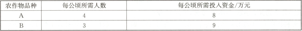 17. 乡村振兴战略实施以来,很多外出人员返乡创业,某村有部分返乡青年承包了一些田地,采用新技术种植$A$,$B$两种农作物.种植这两种农作物每公顷所需人数和投入资金见下表: