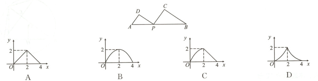 9. 如图,$P$为线段$AB$上一点,$PC// AD$,$PD// BC$,$PC = PD$,$\angle CPD = 90^{\circ}$,$AB = 4$,记$\triangle APD$和$\triangle BPC$的面积分别为$S_{1}$,$S_{2}$.设$PA = x$,$y = S_{1} + S_{2}$,则$y$关于$x$的函数图象为 (