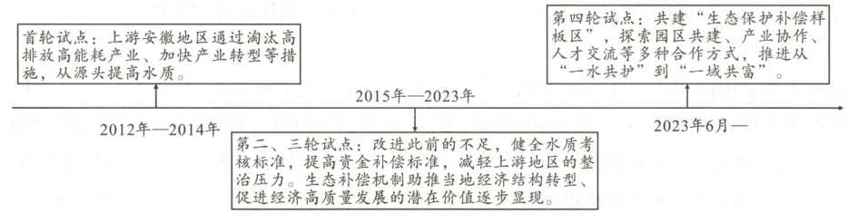 材料一 新安江横跨浙皖两省。2012 年,浙皖两省在新安江启动全国首个跨省流域生态补偿机制试点,历时 11 年完成 3 轮试点,2023 年 6 月开启第四轮试点。历程如下所示: