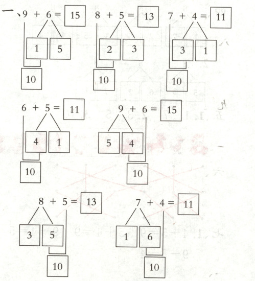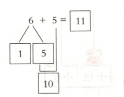 1. 用“凑十法”计算“$9 + 3$”时,可以先把3分成( )和( ),先算$9 +$( )$= 10$,再算$10 +$( )$=$( )。