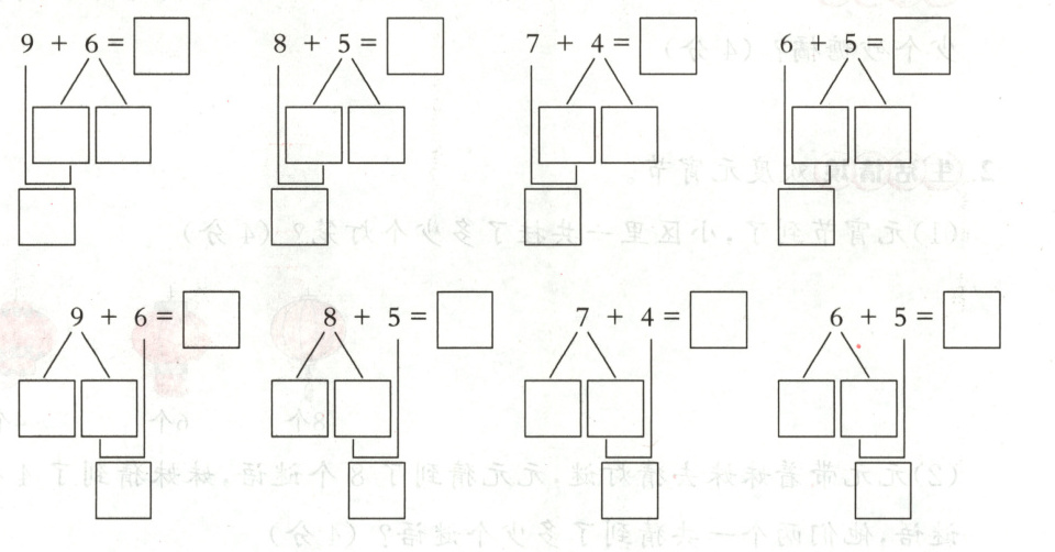 2. 用“凑十法”计算“$8 + 4$”时,可以先把4分成( )和( ),先算$8 +$( )$= 10$,再算$10 +$( )$=$( )。