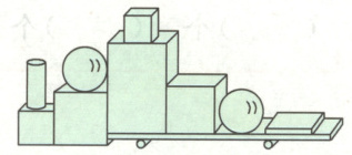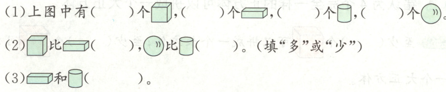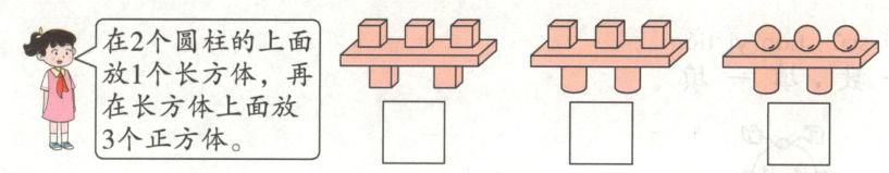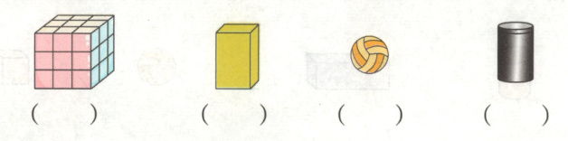 1. 几何直观·在长方体的下面画“√”,在正方体的下面画“×”,在圆柱的下面画“△”,在球的下面画“○”。