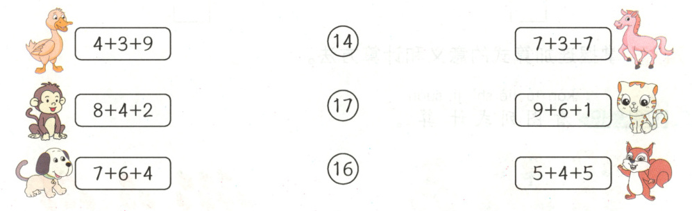 3. 把得数大于 15 的涂上红色,把得数小于 15 的涂上绿色。