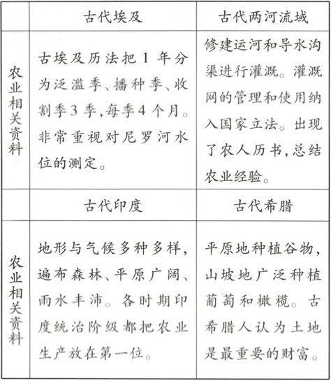 (1)根据上表及所学知识,任选一个古代文明,概括其农业生产发展的条件。(4 分)
