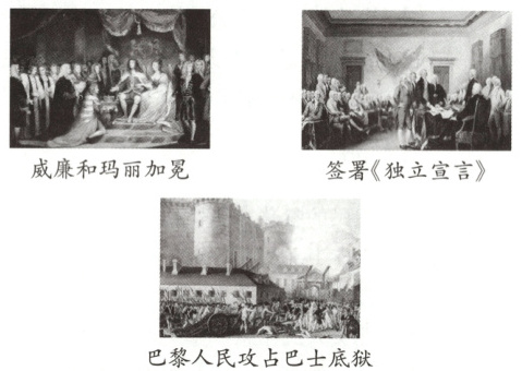(1)【示例一】图1:威廉和玛丽加冕,这幅图片描绘的是1689年,英国的威廉三世和玛丽二世在伦敦西敏寺接受加冕,正式成为英国国王和王后的历史场景。这一事件标志着英国“光荣革命”的结束和君主立宪制的确立。在此之前,英国经历了长时间的斯图亚特王朝专制统治,社会矛盾日益激化。为了维护国家稳定,避免内战爆发,议会与部分贵族于1688年发动了“光荣革命”,邀请荷兰执政威廉及其妻子玛丽共同统治英国。威廉和玛丽加冕后,议会通过了一系列法律文件,限制了王权,确立了议会主权,为英国现代政治制度的发展奠定了基础。