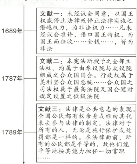 (2)共同理念:这三部文献体现了三个国家政治近代化的共同理念,即限制王权(或君主权力)、确立民主(或议会主权)、实行法治(或法律至上)。(2分)