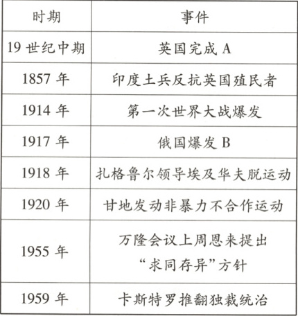 (2)【围绕主题自拟观点论述】根据材料二并结合所学知识,补充完整A、B两处,围绕“民族解放运动”自拟观点,从上表中选择两个史实进行论述。(要求:观点正确,史论结合,表述成文。8分)