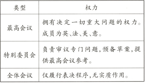 5. 新考法 [新素材·会议类型]下表为巴黎和会上的三种会议类型。据表可知,巴黎和会(