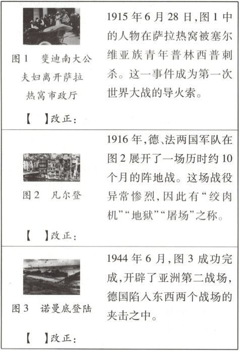 16. 两次世界大战对世界产生了深远影响。辨别下列史实的正误,在该题下的括号内正确的打“√”;错误的打“×”,并加以改正。