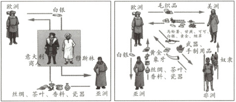 13. C 【解析】考查点:殖民掠夺的影响;解题思路:根据题干两幅图并结合所学知识可知,从左图到右图,贸易范围从欧洲—亚洲扩展到欧洲—亚洲—美洲—非洲,这种贸易往来的扩大和多样化,反映了殖民掠夺促进了不同地区之间的经济联系,有助于世界市场逐渐形成,C项正确;图中主要体现的是贸易往来,并没有突出欧洲文化对殖民地社会发展的推动,排除A项;图中重点不是欧洲社会对东方文化的关注热潮,而是贸易格局的变化,排除B项;新航路开辟在文艺复兴之后,且图中未体现新航路开辟与文艺复兴的关系,排除D项。