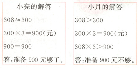 5. 为了节能环保,妈妈准备买 3 个空调扇。准备 900 元够吗?下面是小亮和小月的解答。