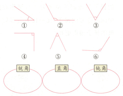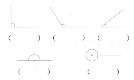 (1)等于 $90^{\circ}$ 的角是( );小于 $90^{\circ}$ 的角是( );大于 $90^{\circ}$ 而小于 $180^{\circ}$ 的角是( );等于 $180^{\circ}$ 的角是( );等于 $360^{\circ}$ 的角是( )。
