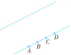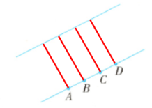 8. 下面两条直线互相平行,过一条直线上的A,B,C,D四点分别向另一条直线作垂直的线段。量一量这些线段之间有什么关系。