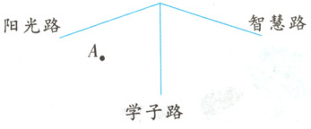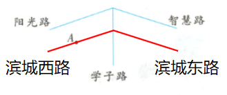 6. 如图是某城的局部交通线路图,该城准备修一条滨城路。根据规划,滨城路分为滨城西路和滨城东路两段,这两段与学子路在同一处交会。滨城西路在学子路左侧过A点且与阳光路平行,滨城东路在学子路右侧且与智慧路平行。请你画出滨城路。