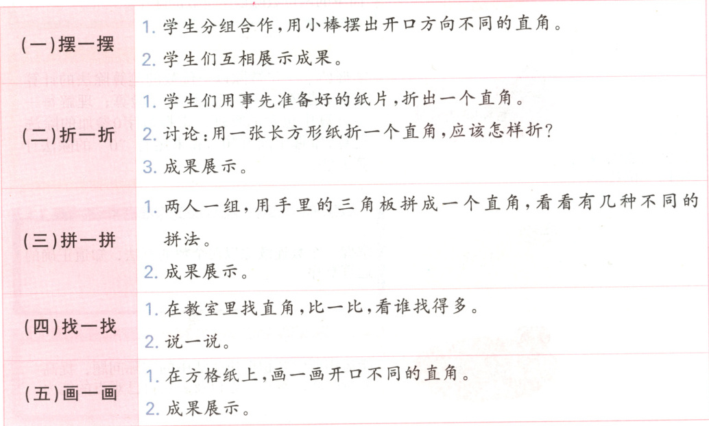 通过摆一摆、折一折、拼一拼、找一找、画一画等活动,加深学生对直角的认识。